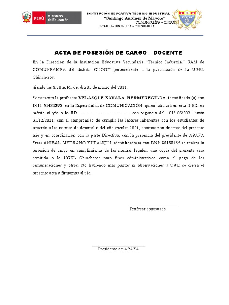 ACTA DE POSESIÓN DE CARGO – DOCENTE