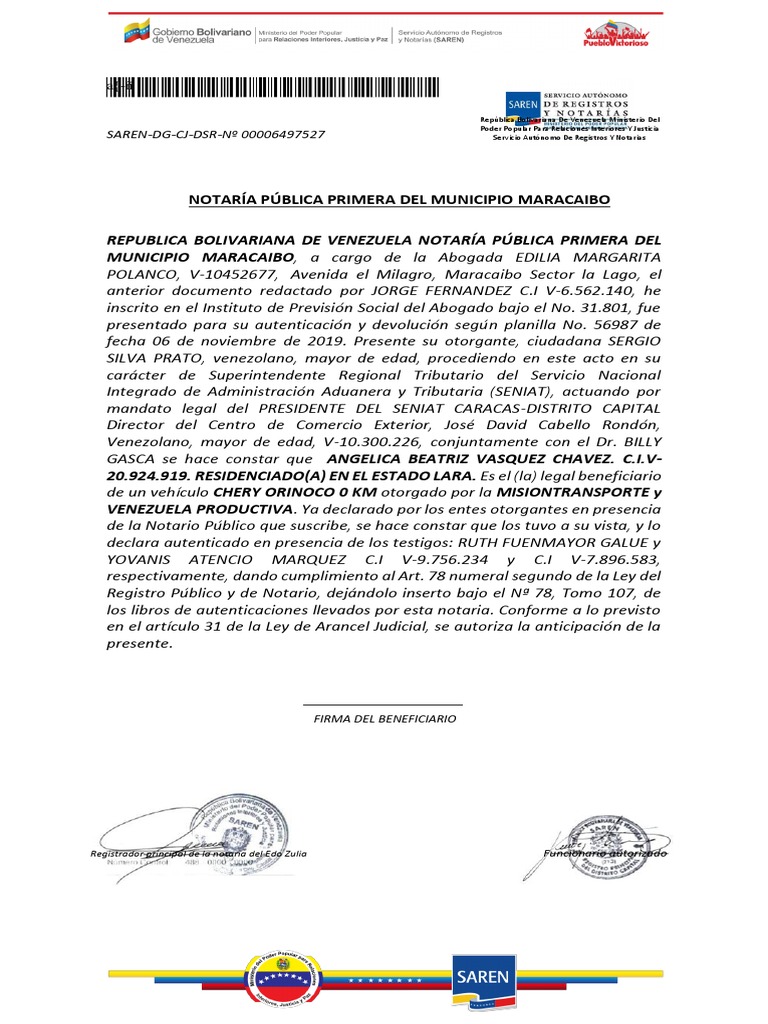 Registrador principal de la notaria del Edo Zulia Funcionario autorizado