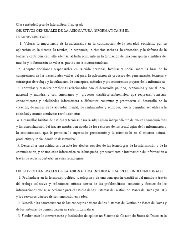 preuniversitario, con el #5 de los objetivos generales de la asignatura informática en el undécimo grado,