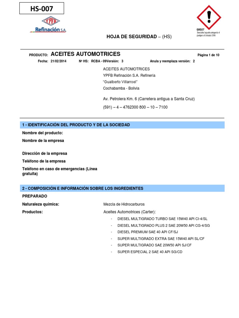 PRODUCTO: ACEITES AUTOMOTRICES Página 1 de 10