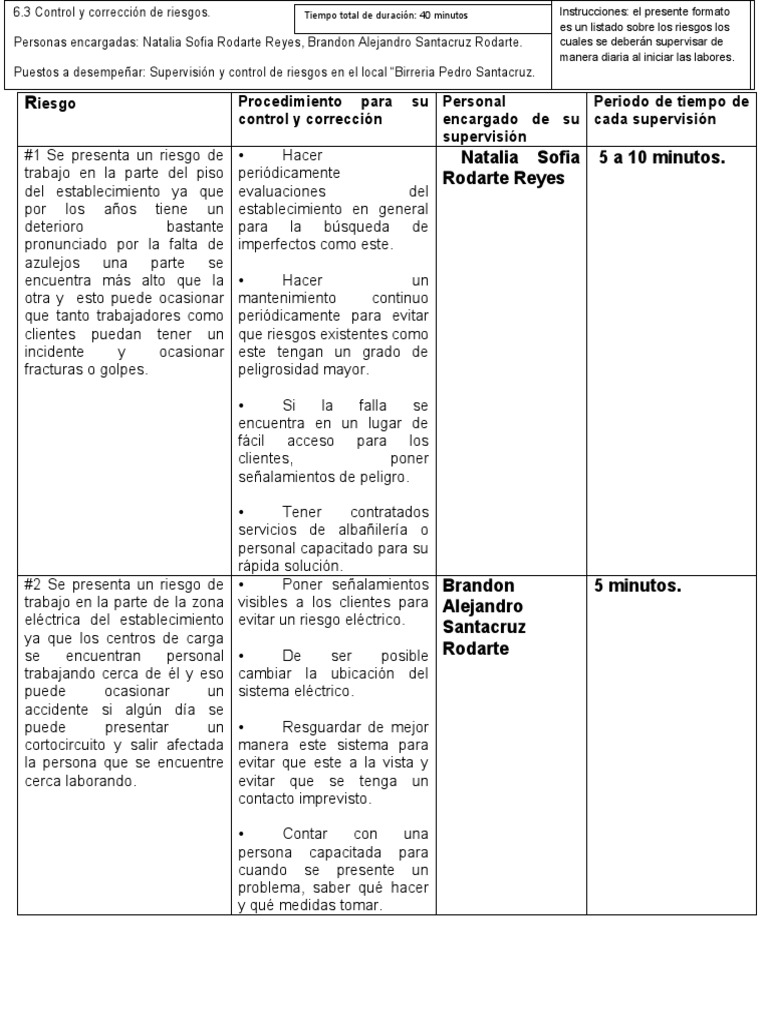 Personas encargadas: Natalia Sofia Rodarte Reyes, Brandon Alejandro Santacruz Rodarte. cuales se deberán supervisar de