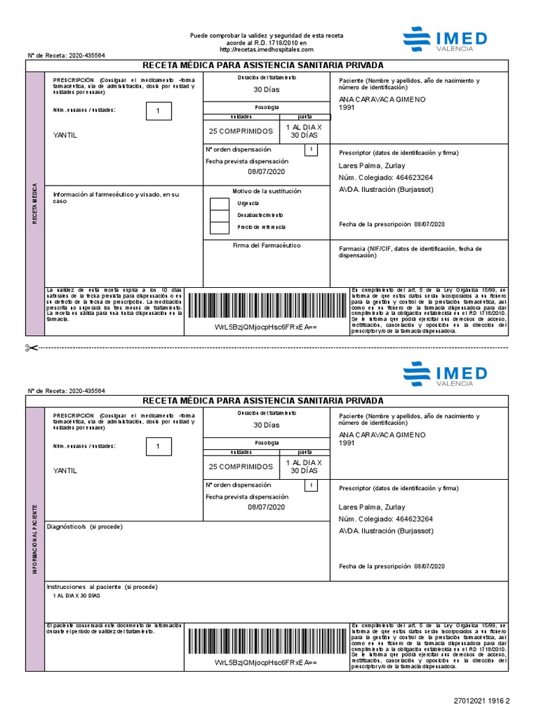 La receta es válida para una única dispensación en la cumplimiento a la obligación establecida en el RD 1718/2010.