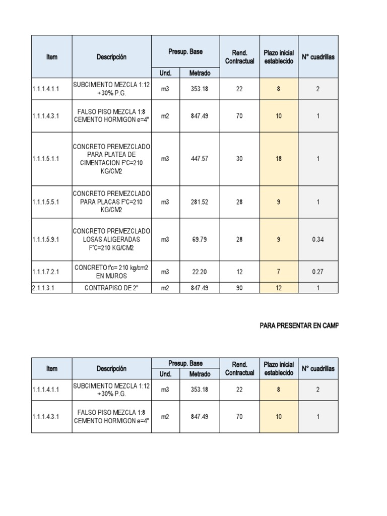 Mano de obra Rend. %Rend. Plazo nuevo Días adicionales