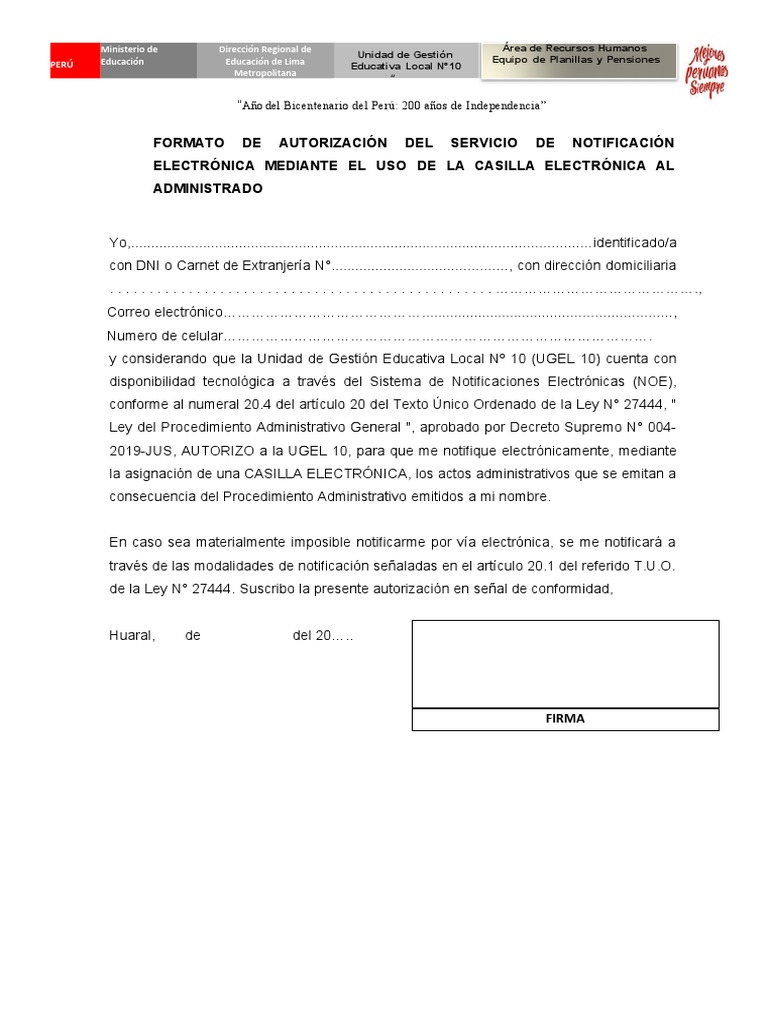 2019-JUS, AUTORIZO a la UGEL 10, para que me notifique electrónicamente, mediante