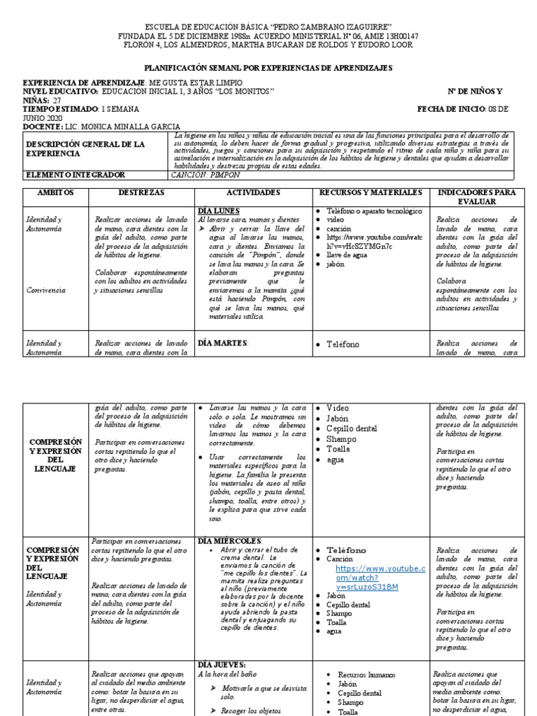 PLANIFICACIÓN SEMANL POR EXPERIENCIAS DE APRENDIZAJES