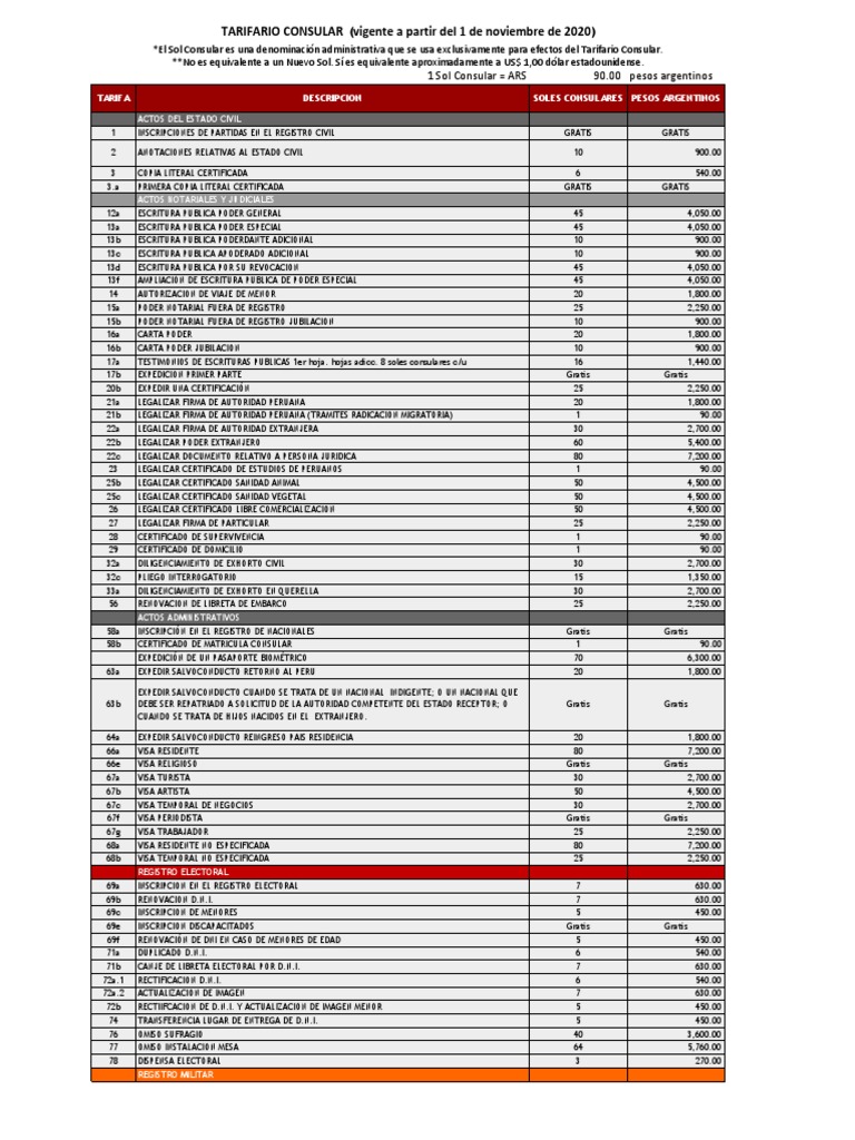 TARIFA DESCRIPCION SOLES CONSULARES PESOS ARGENTINOS