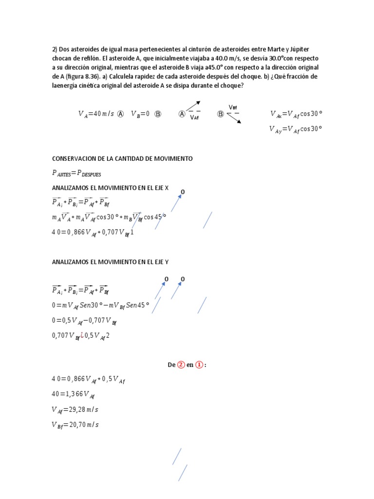 de A (figura 8.36). a) Calculela rapidez de cada asteroide después del choque. b) ¿Qué fracción de