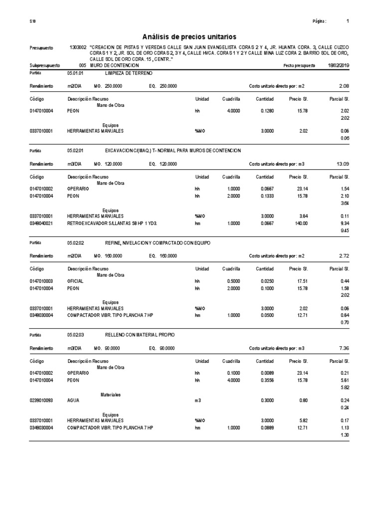 Código Descripción Recurso Unidad Cuadrilla Cantidad Precio S/. Parcial S/.