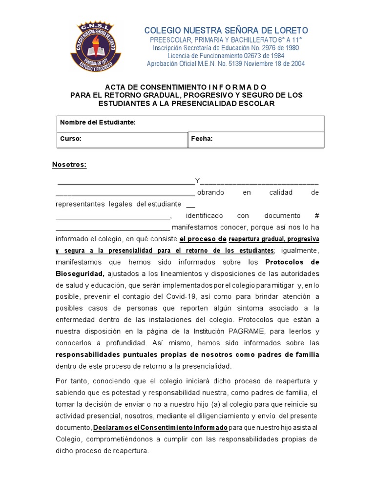 documento, Declaramos el Consentimiento Informado para que nuestro hijo asista al