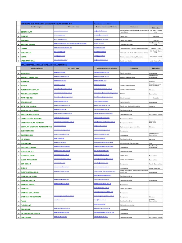 EMPRESAS QUE TRABAJAN EN ENERGÍA SOLAR CON EL INTI Actualizado: enero 2012