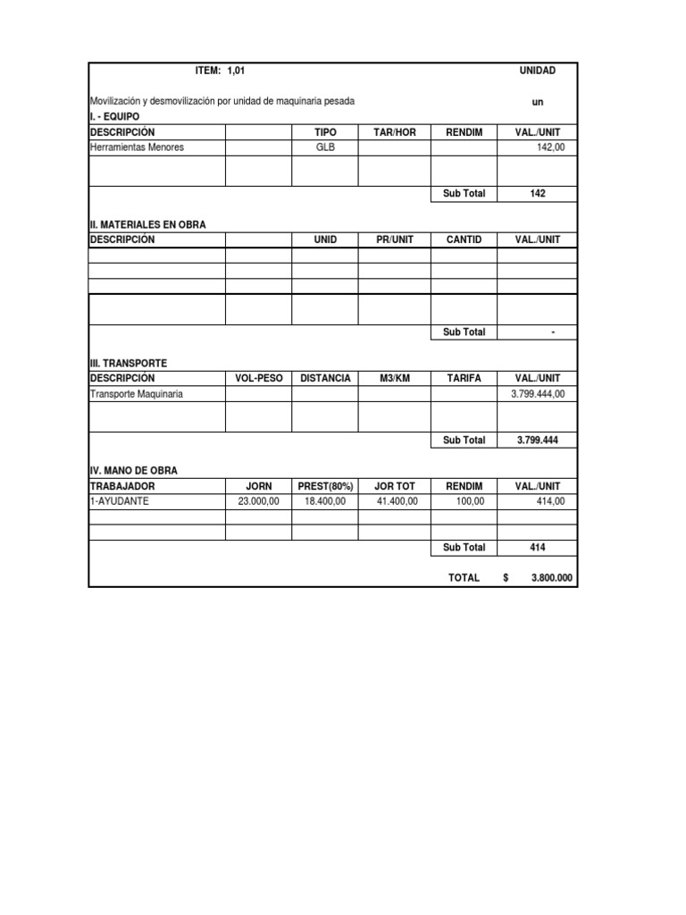 Movilización y desmovilización por unidad de maquinaria pesada un