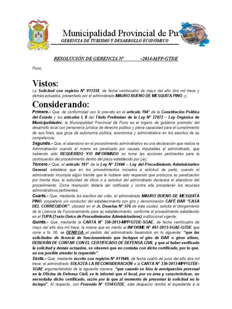 RESOLUCIÓN DE GERENCIA N° -2014-MPP-GTDE