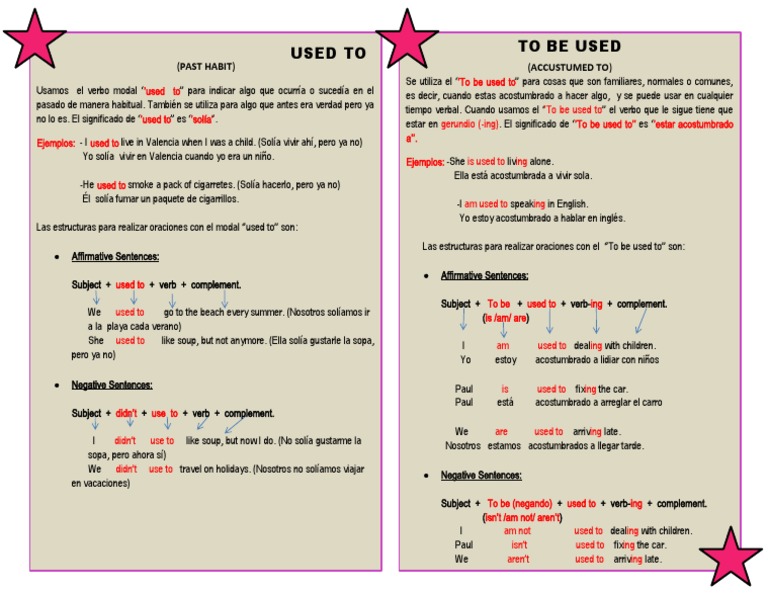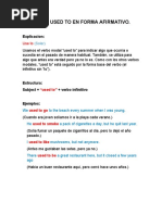 pasado de manera habitual. También se utiliza para algo que antes era verdad pero ya tiempo verbal. Cuando usamos el ‘’To be used to’’ el verbo que le sigue tiene que