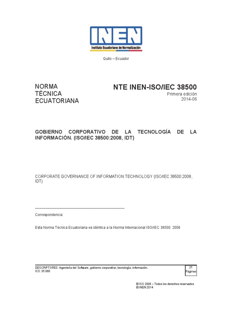 Esta Norma Técnica Ecuatoriana NTE INEN-ISO/IEC 38500, es una traducción idéntica a la Norma