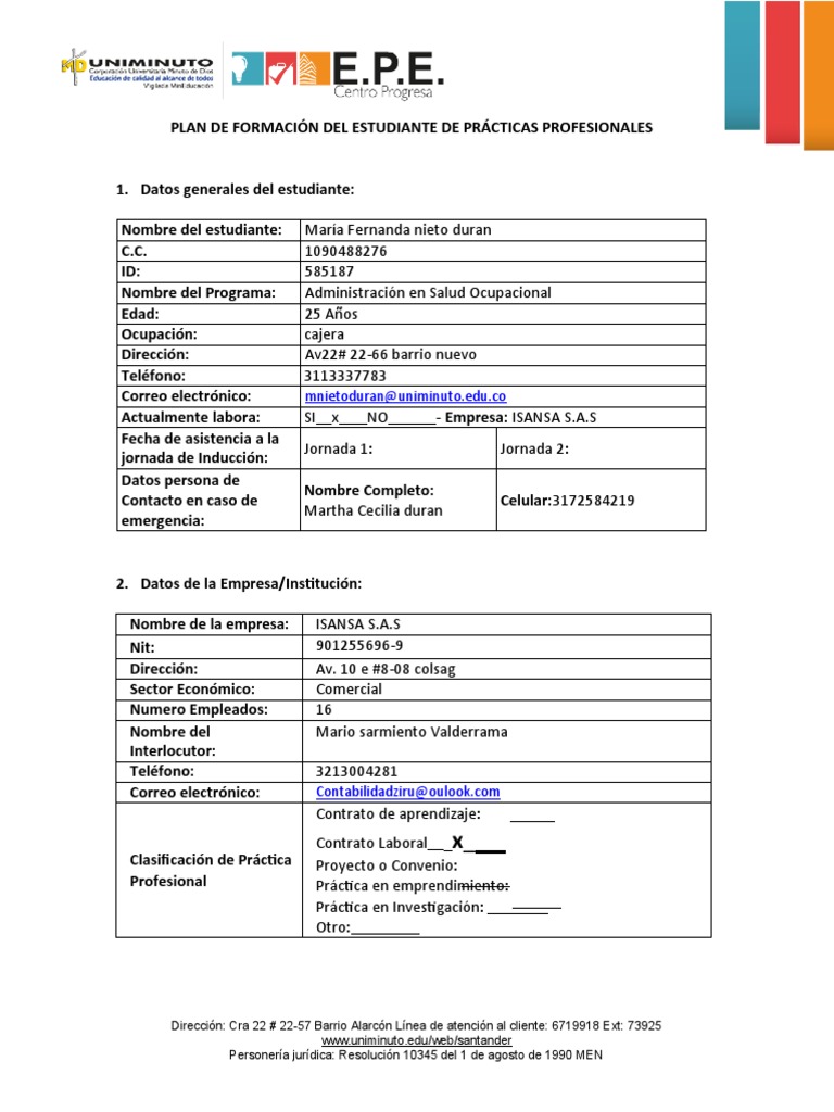 Actualmente labora: SI x NO - Empresa: ISANSA S.A.S