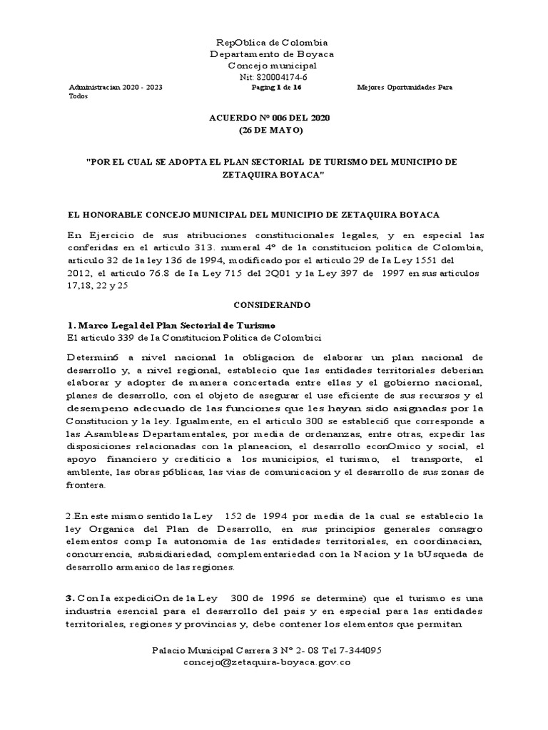 elaboraCion del Plan Sectorial de Turismo de acuerdo con los articulos 1,2, 16, 29,