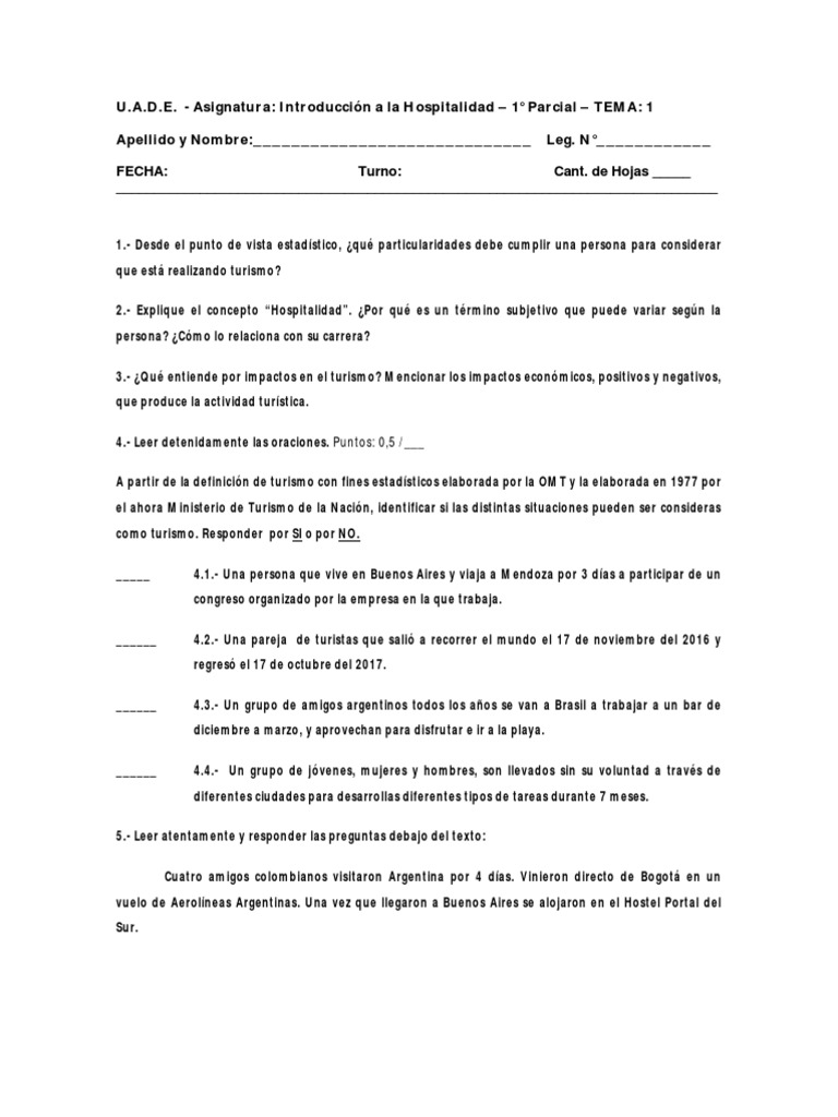 - Asignatura: Introducción a la Hospitalidad – 1° Parcial – TEMA: 1
