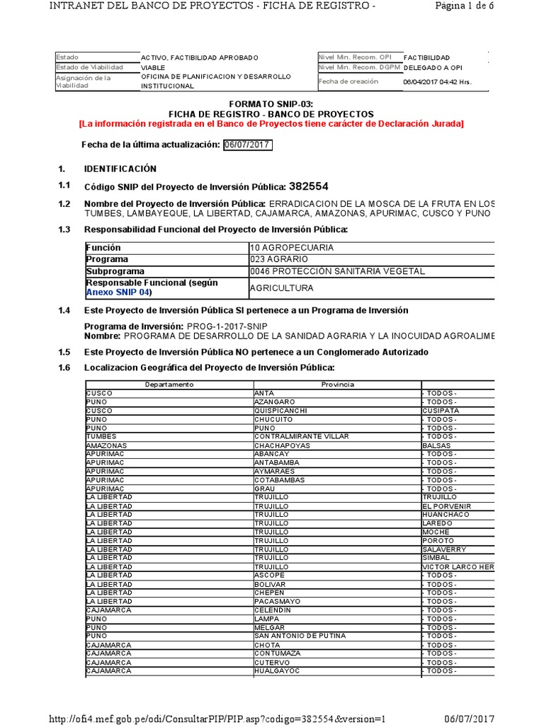 1.2 Nombre del Proyecto de Inversión Pública: ERRADICACION DE LA MOSCA DE LA FRUTA EN LOS DEPARTAM