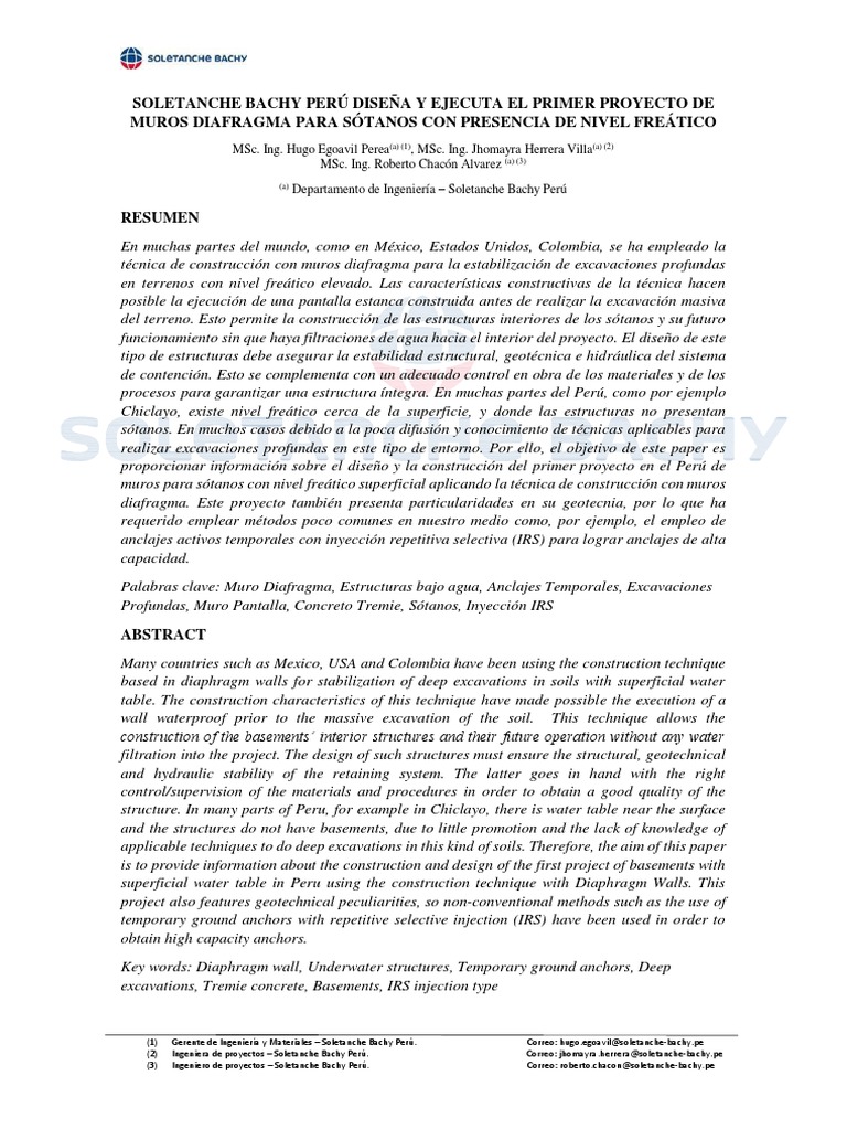superficial water table in Peru using the construction technique with Diaphragm Walls. This