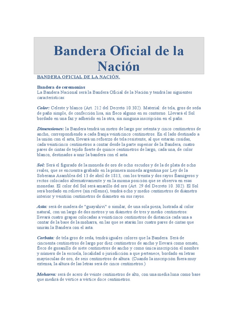 edificio escolar y en los mástiles será la Bandera Oficial de la Nación de lanilla con