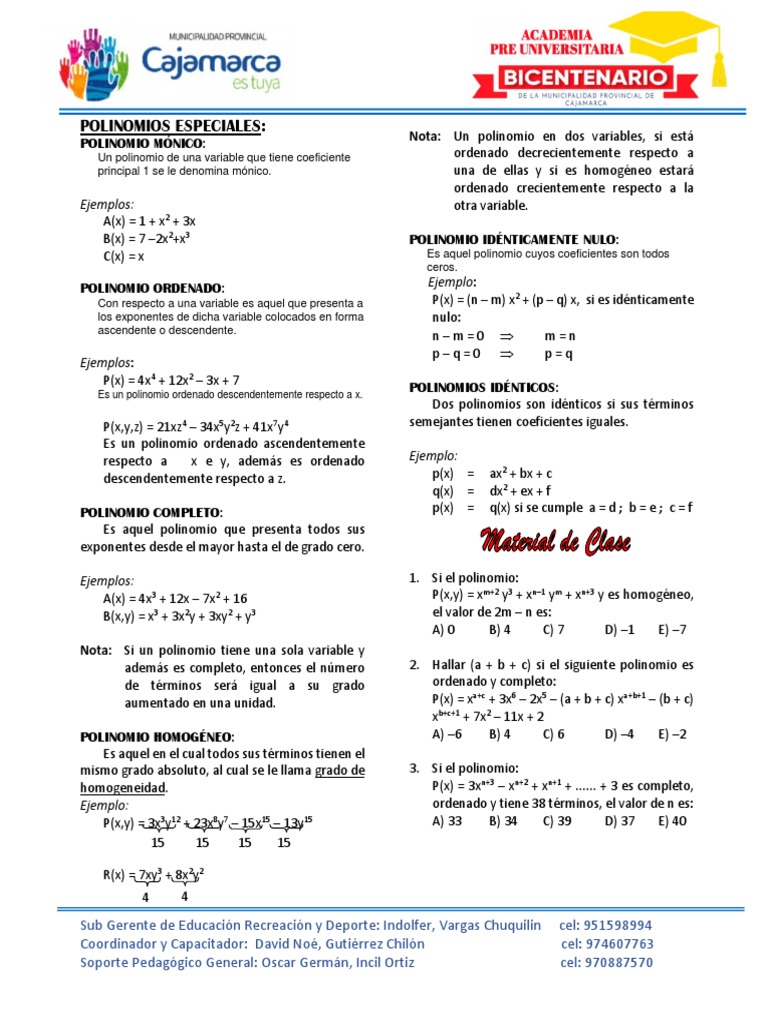4. Si el polinomio ordenado decreciente y 12. El polinomio: