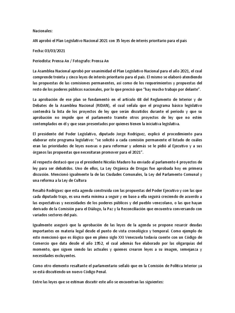 La Asamblea Nacional aprobó por unanimidad el Plan Legislativo Nacional para el año 2021, el cual
