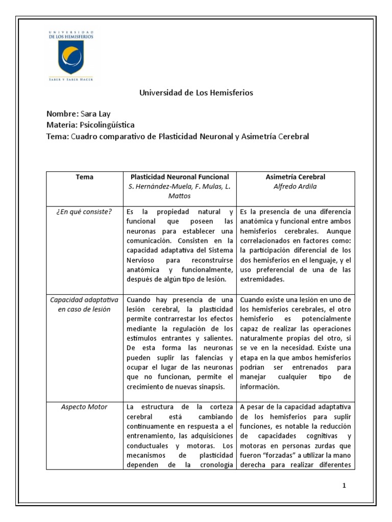 Tema: Cuadro comparativo de Plasticidad Neuronal y Asimetría Cerebral