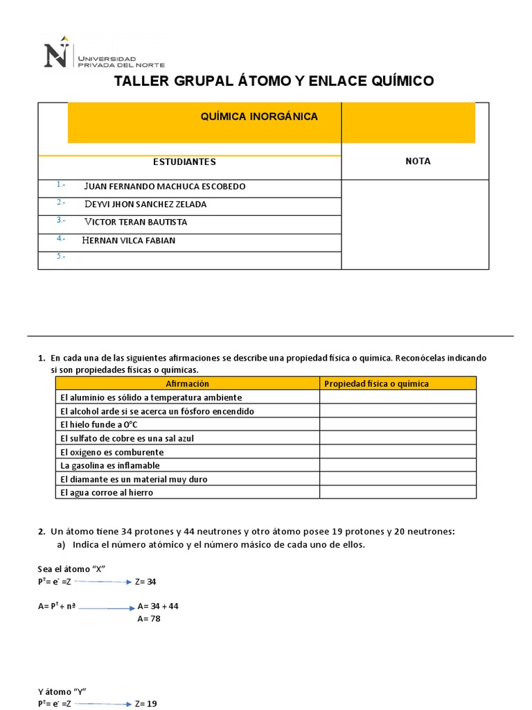 TALLER GRUPAL ÁTOMO Y ENLACE QUÍMICO