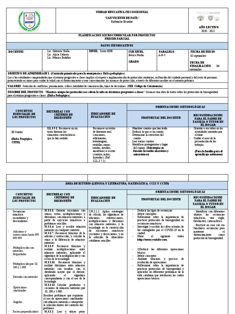 DOCENTES: Lic. Gabriela Ureña NIVEL: Sexto EGB SUB NIVEL: PARALELO: FECHA DE INICIO: