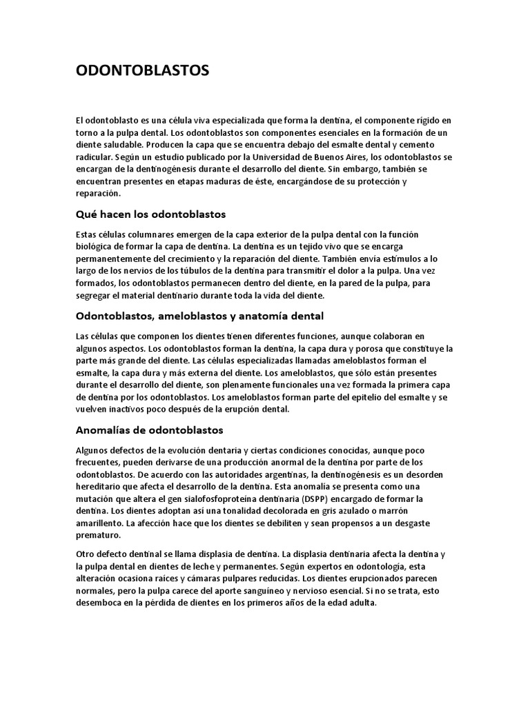 odontoblastos. De acuerdo con las autoridades argentinas, la dentinogénesis es un desorden