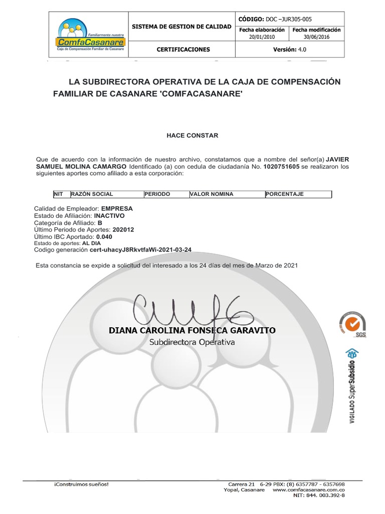 SAMUEL MOLINA CAMARGO Identificado (a) con cedula de ciudadanía No. 1020751605 se realizaron los