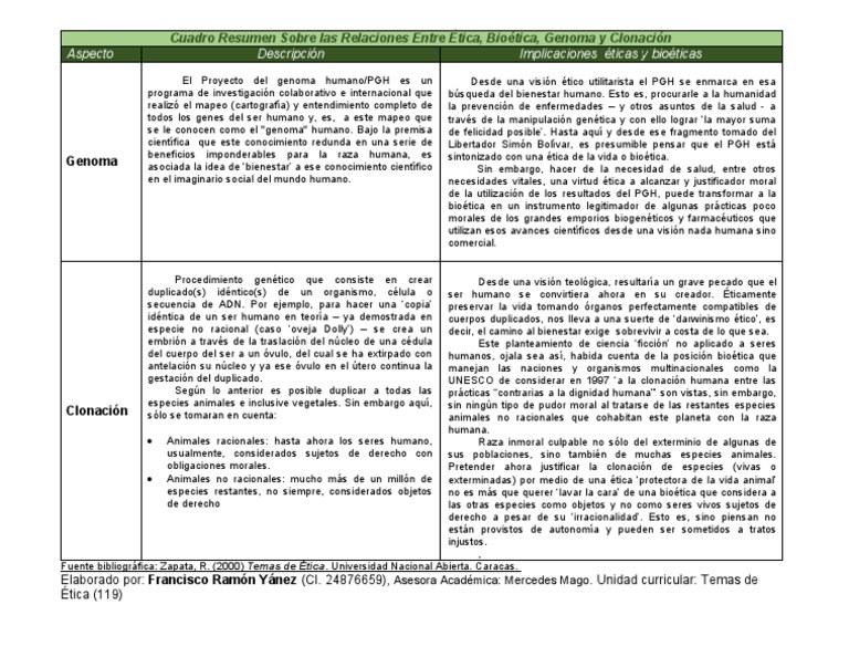 Cuadro Resumen Sobre las Relaciones Entre Ética, Bioética, Genoma y Clonación