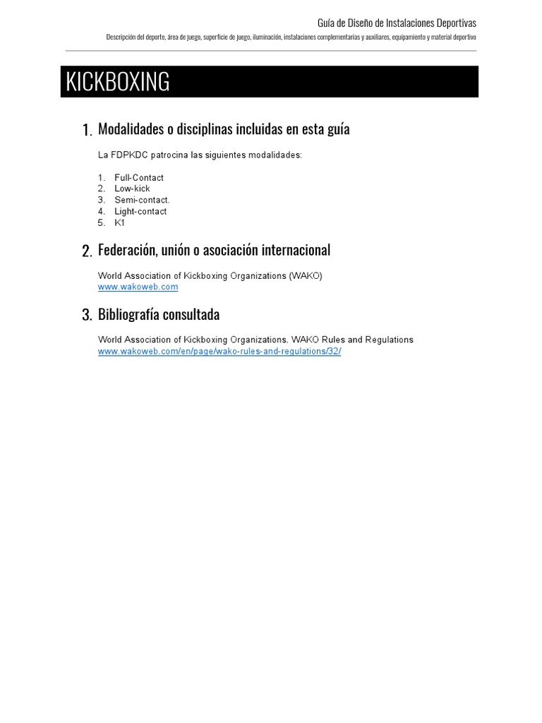Descripción del deporte, área de juego, superficie de juego, iluminación, instalaciones complementarias y auxiliares, equipamiento y material deportivo