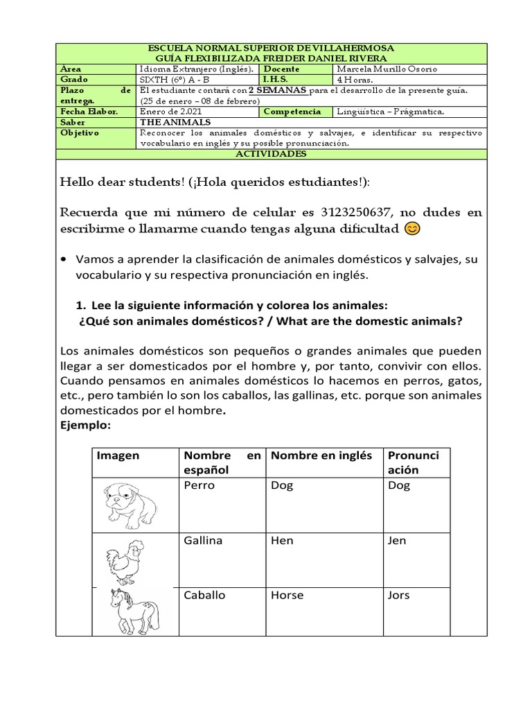 la pronunciación de mínimo 10 animales de los anteriores listados.