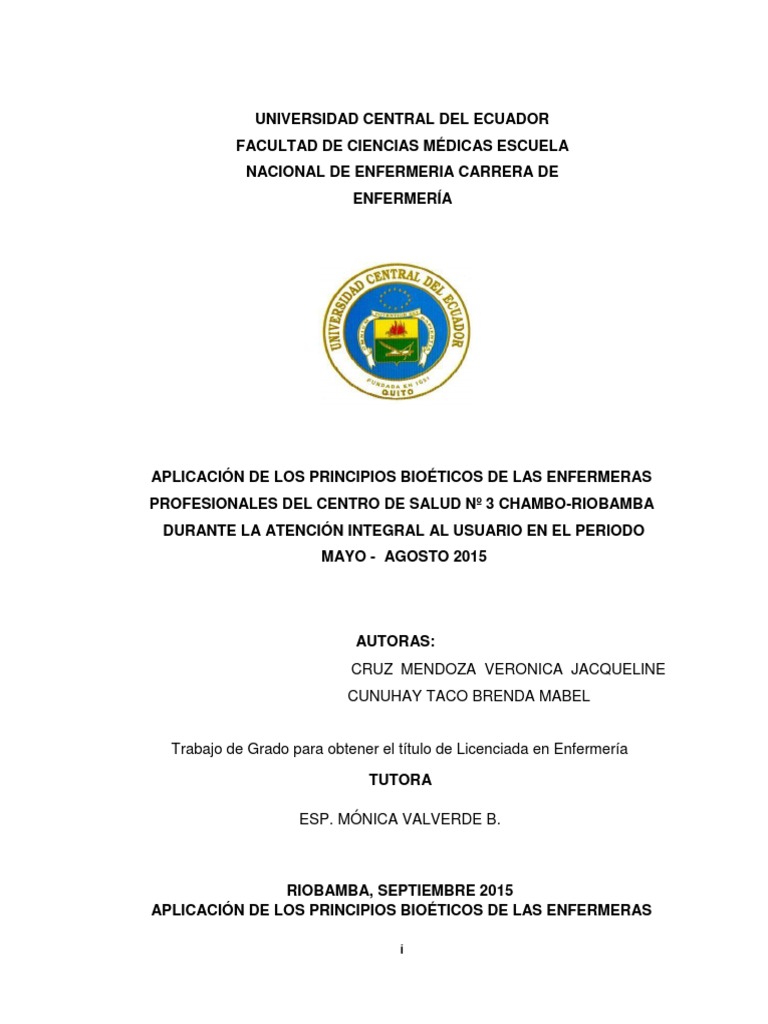 cuyo tema es: “APLICACIÓN DE LOS PRINCIPIOS BIOÉTICOS DE LAS