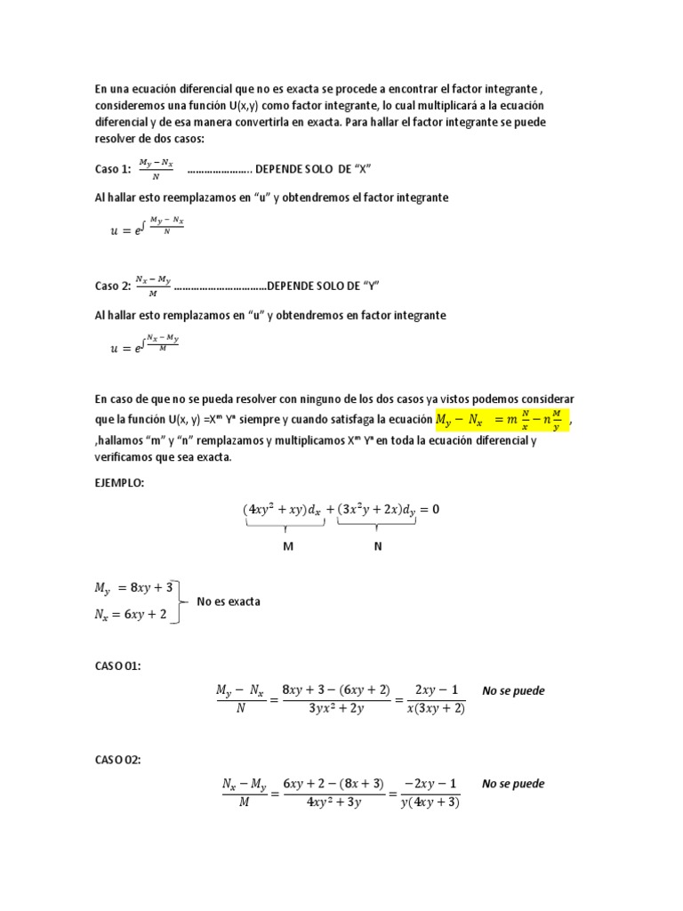En una ecuación diferencial que no es exacta se procede a encontrar el factor integrante ,