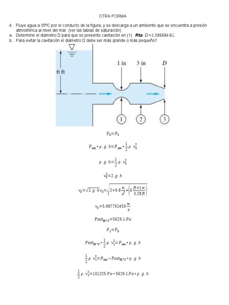 a. Determine el diámetro D para que se presente cavitación en (1) Rta: D=1.586684 ∈¿