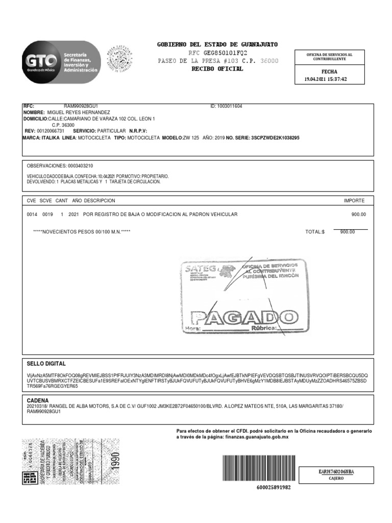 0014 0019 1 2021 POR REGISTRO DE BAJA O MODIFICACION AL PADRON VEHICULAR 900.00