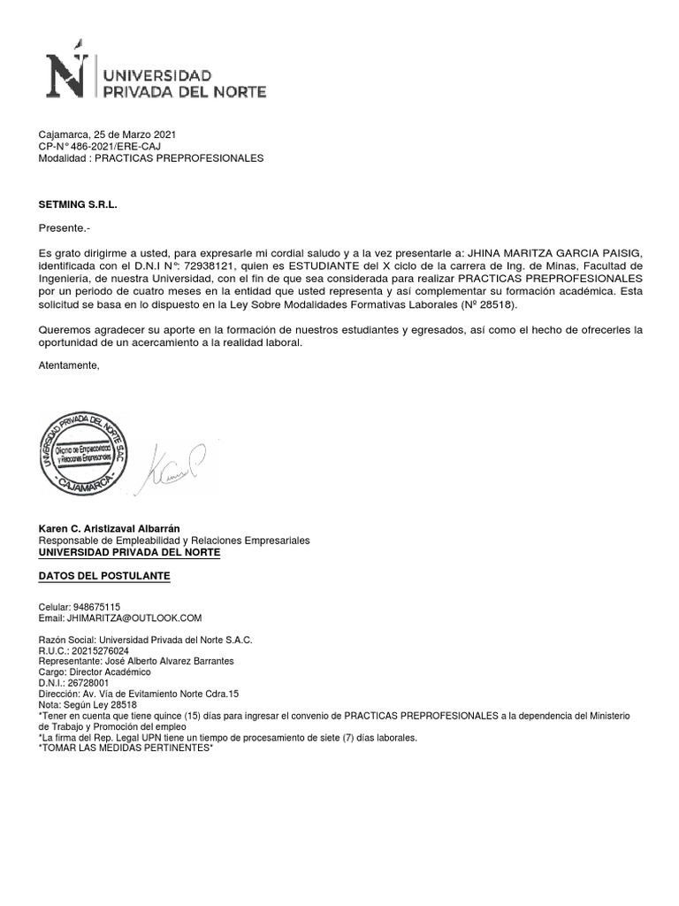 Ingeniería, de nuestra Universidad, con el fin de que sea considerada para realizar PRACTICAS PREPROFESIONALES