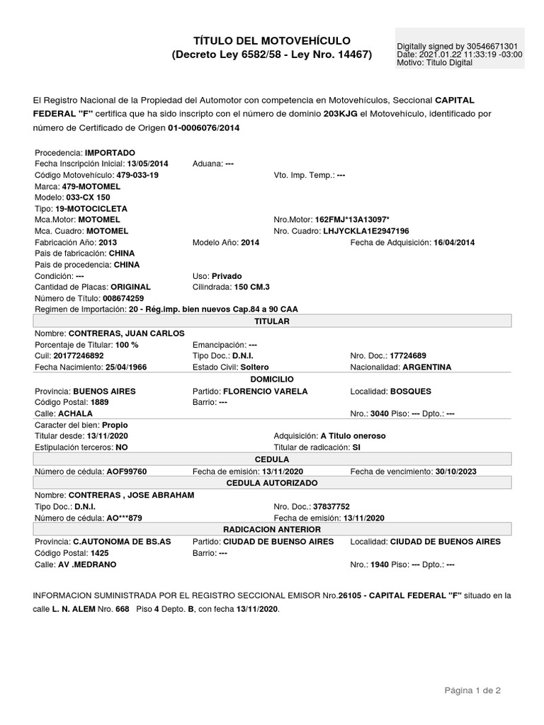 Titular desde: 13/11/2020 Adquisición: A Titulo oneroso