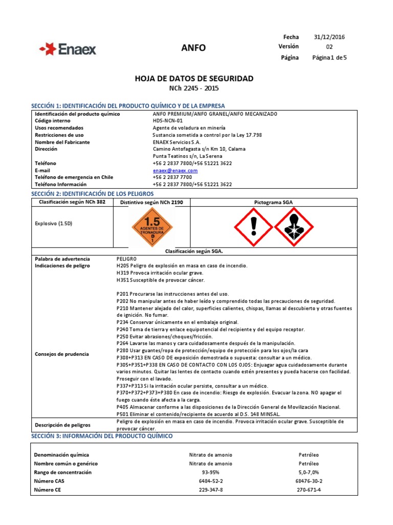 Identificación del producto químico ANFO PREMIUM/ANFO GRANEL/ANFO MECANIZADO