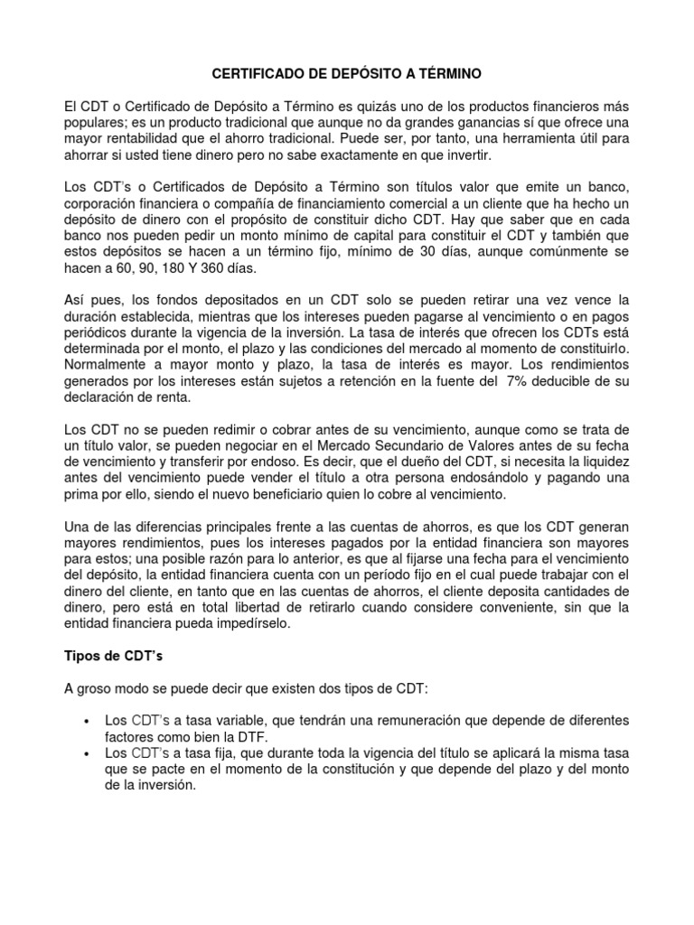 depósito de dinero con el propósito de constituir dicho CDT. Hay que saber que en cada