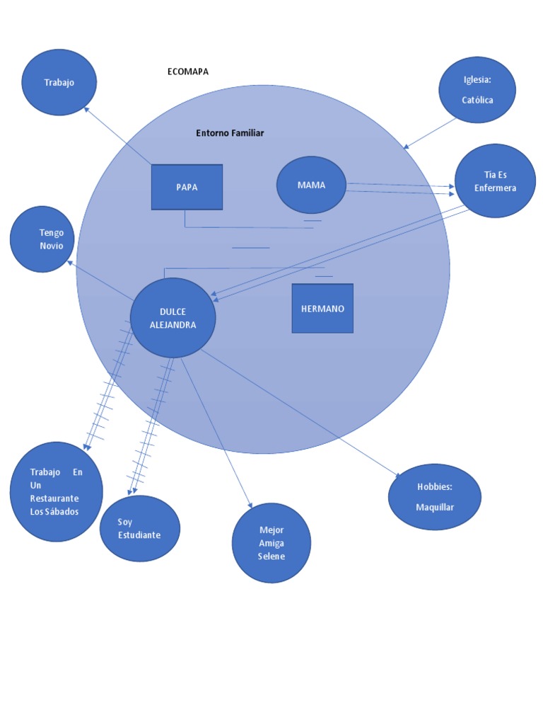 El ecograma muestra la familia de la persona, incluidos sus padres, hermanos, tía y novio. Trabaja los sábados en un restaurante y asiste a la iglesia católica. Sus hobbies incluyen maquillarse.