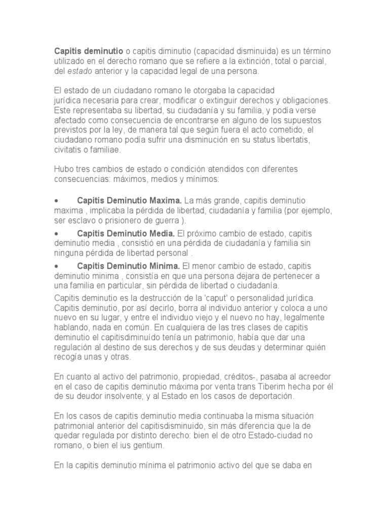 Capitis deminutio es la destrucción de la 'caput' o personalidad jurídica.