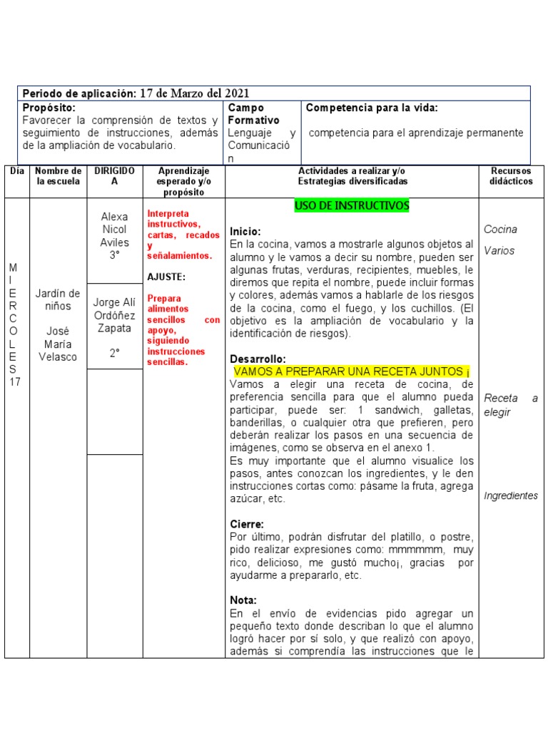 Día Nombre de DIRIGIDO Aprendizaje Actividades a realizar y/o Recursos
