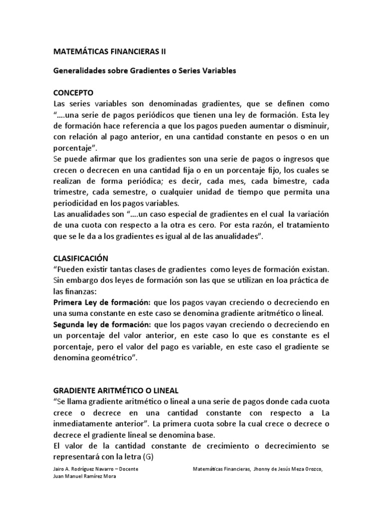 “Se llama gradiente aritmético o lineal a una serie de pagos donde cada cuota