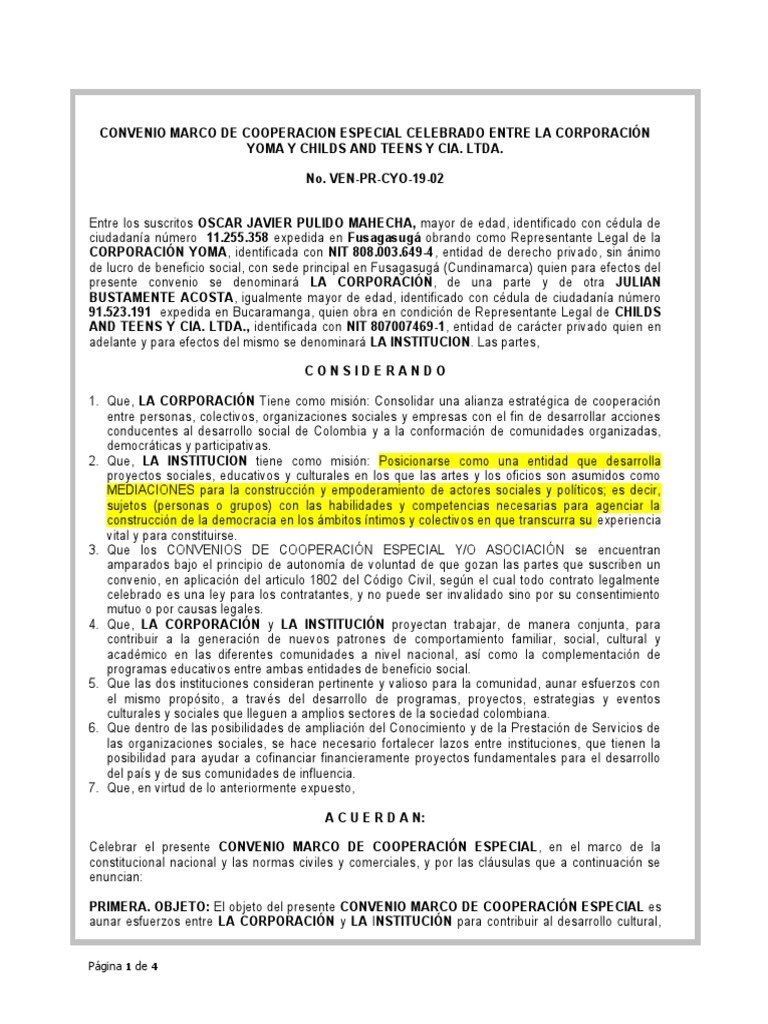 COOPERACION ESPECIAL requiere para su validez y perfeccionamiento la firma de las partes