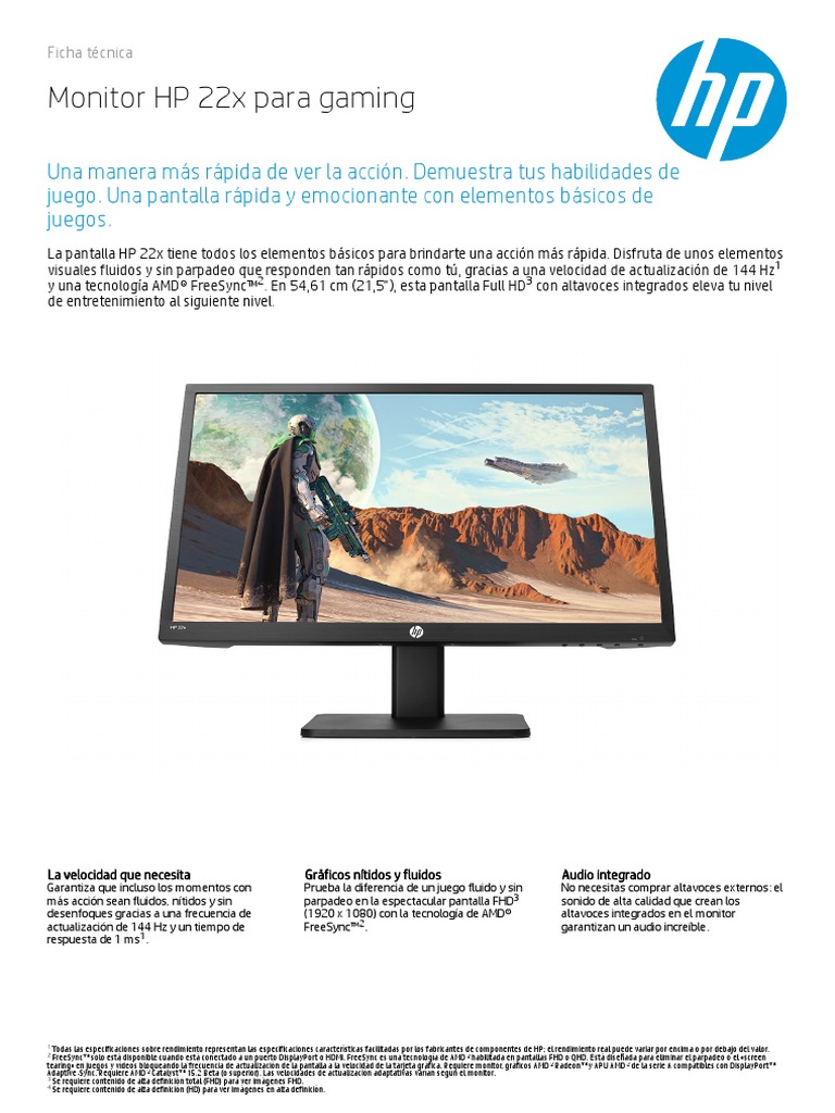 y una tecnología AMD® FreeSync™2. En 54,61 cm (21,5"), esta pantalla Full HD3 con altavoces integrados eleva tu nivel