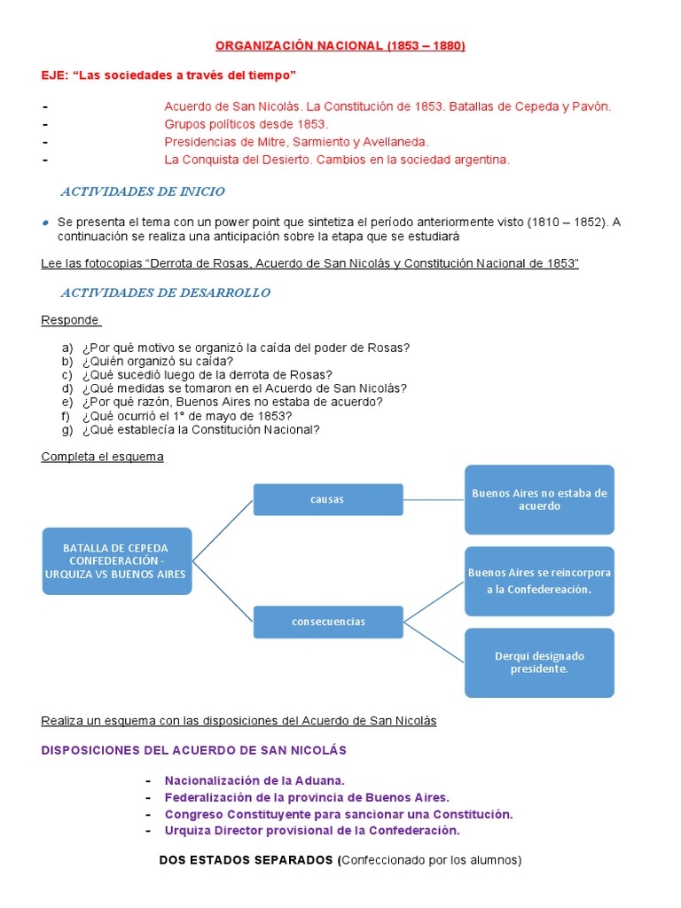 - Acuerdo de San Nicolás. La Constitución de 1853. Batallas de Cepeda y Pavón.