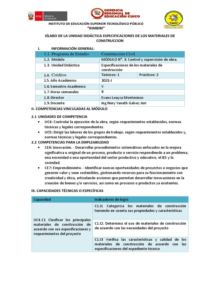SÍLABO DE LA UNIDAD DIDÁCTICA ESPECIFICACIONES DE LOS MATERIALES DE